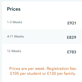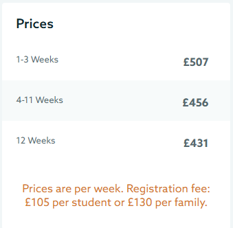 - 등록비는 학생별 105파운드 또는 가족별 130파운드입니다.
