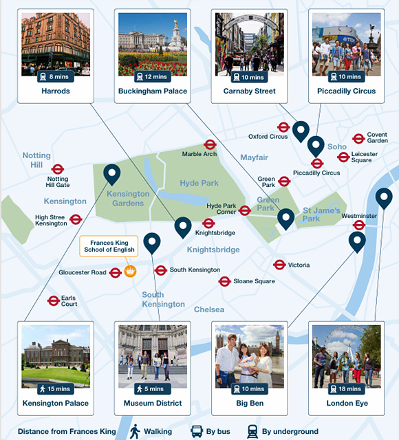 프란세스킹 캠퍼스는 Gloucester Road 역 바로 앞, 사우스 켄싱턴(Kensington)에 위치합니다.