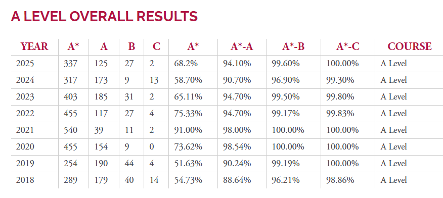 수학, 컴퓨터 과학 등 STEM 핵심 과목 응시생의 70% 이상이 A-A*를 기록했습니다. 졸업생 대다수가 G5 및 러셀 그룹 대학에 합격하며 명성을 이어가고 있습니다.