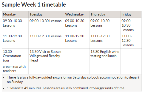 시간표를 보면 영어 수업은 오전 9시부터 12시 30분까지 있고 월요일 오후에는 교사들과 크림티를, 화요일에는 서식스 빌리지와 해변가 여행을, 목요일에는 와인 테이스팅과 점심을 함께 해요.