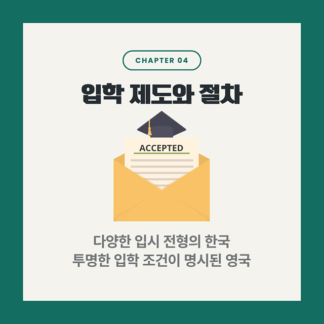 영국 학부 과정은 대부분 UCAS라는 통합 시스템을 통해 지원해요. 한 번의 원서로 최대 5개의 대학과 전공을 선택할 수 있고, A-Level과 같은 학업 성적 , 자기소개서, 추천서, 경우에 따라 면접까지 평가 요소가 됩니다. A-Level도 수능처럼 하루에 치르는게 아니라 여러 날, 그리고 여러 항목으로 평가를 받게 되요. 또, 각 대학교 홈페이지에 정확한 입학조건이 써 있어서 투명합니다.