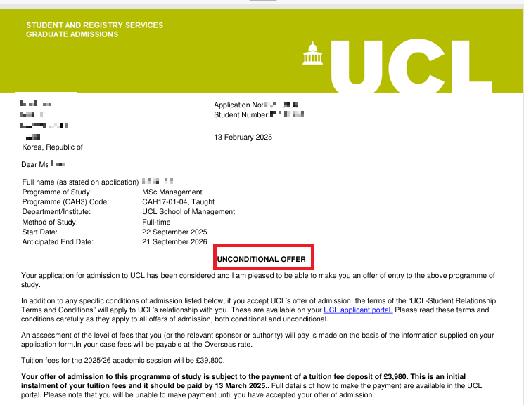 UCL 경영학 석사 언컨디셔널 오퍼