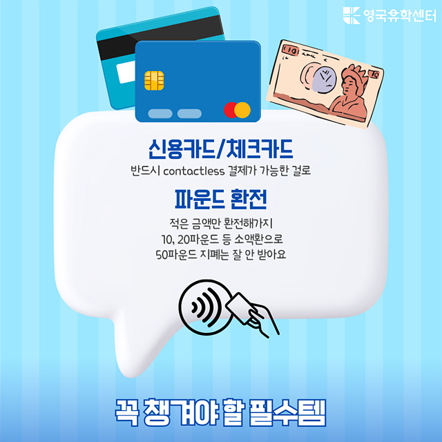 본인이 갖고 계신 신용카드 뒷면에 이 표시가 되어 있다면 컨택리스 결제가 가능하구요, 비접촉 신용카드로 영국 대부분의 지역에서 버스, 지하철 바로 이용 가능해요. 이유없이 카드 결제가 안될때도 있으니, 2-3개 정도 챙겨가세요. 애플페이도 미리 연결해두시면 편해요.