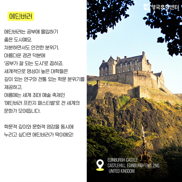 에딘버러는 학문적 깊이와 전통적인 대학 도시 분위기를 원하는 학생에게 정말 추천드려요.
