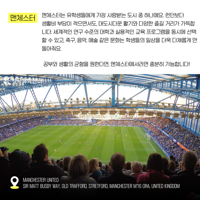 학생 친화적인 분위기 속에서 유학생 커뮤니티도 활발하고, 축구 팬이라면 맨체스터 유나이티드·맨체스터 시티 경기 관람도 즐길 수 있죠.