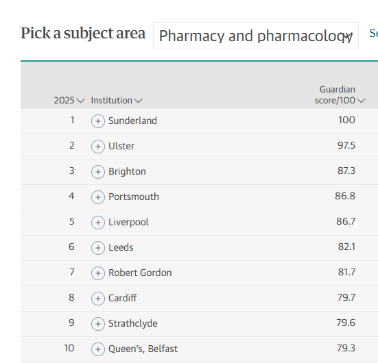 출처. The Guardian Best UK universities for pharmacy and pharmacology – league table.   Best UK universities for pharmacy & pharmacology – league table | Pharmacy and pharmacology | The Guardian