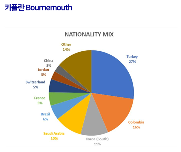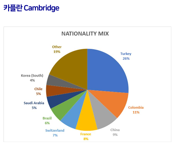 한국이 아닌 해외에서 영어를 배우는 이유가 바로 영어환경에 많이 노출되고 다양한 국적의 친구를 만나는 것인만큼 어학연수를 계획하시는 분들께서 중요하게 생각하시는 부분 중 하나가 바로 국적비 입니다.
