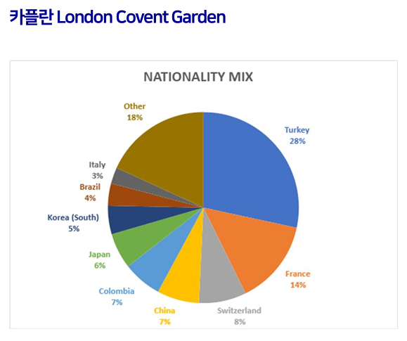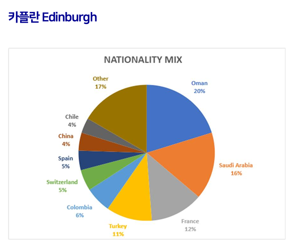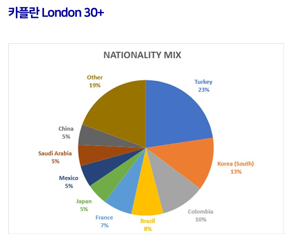 영국에만 9개의 센터가 있는 체인스쿨인 카플란 어학원의 센터별 학생 인원과 국적 비율을 살펴봅니다.