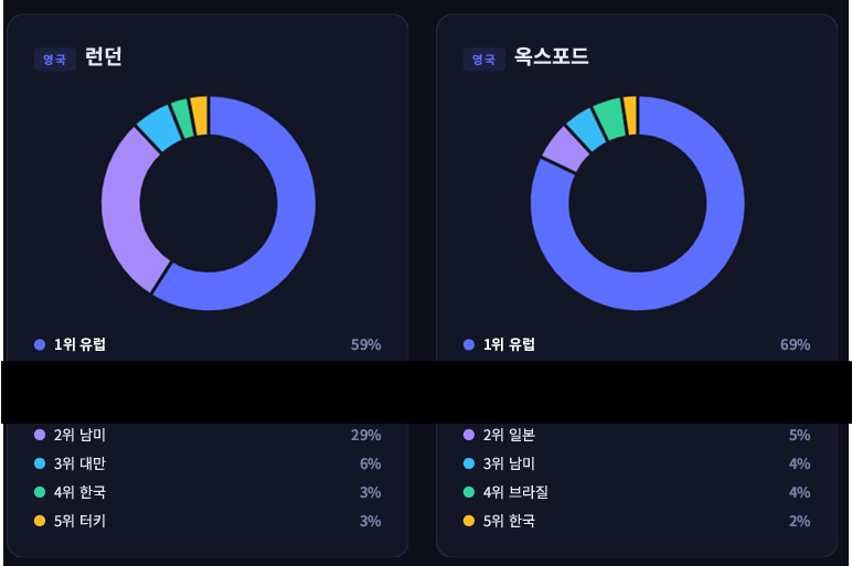 평균 20-30 %를 유지하는 미국, 캐나다에서의 한국 학생 비율에 비해 영국 카플란 센터에서는 런던센터를 제외한 전센터에서 한국학생 비율이 10%로 현저하게 낮은 점을 확인할 수 있습니다.