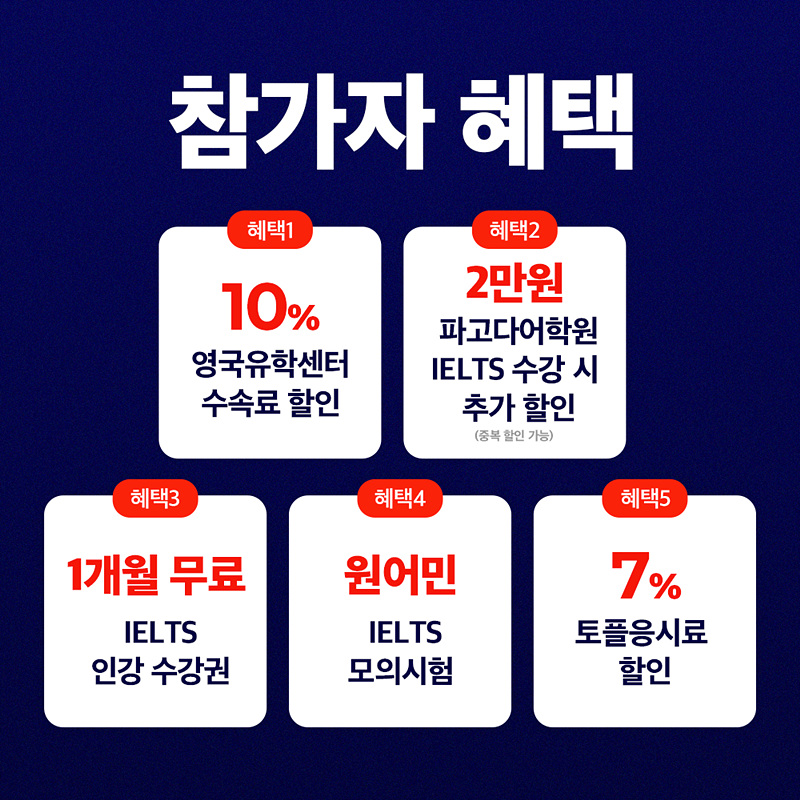 - 파고다어학원 IELTS 수강 시 2만 원 추가 할인 (중복 할인 가능)
