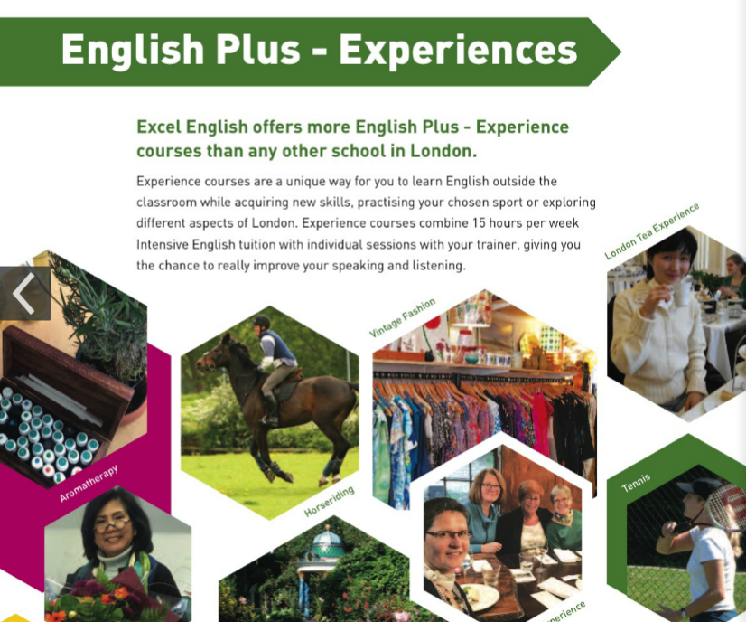 오전에 영어수업을 하고, 오후에는 칵테일, 아로마테라피, 스포츠(골프/승마/테니스), 축구, 영국 꽃꽃이, 꽃&가든, 런던 티(tea), 유리공예, 빈티지패션 등을 영어학습과 같이 체험할 수 있는 코스입니다! 요즘은 어학연수 가서 이런 다양한 체험을 하는게 트렌드인데요, 바쁜 일상에서 벗어나 어학연수를 가서 영어도 배우면서, 취미 개발도 같이 하세요:)