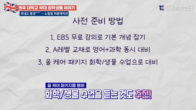 이 학생은 입학 전 EBS 무료 강의로 화학·생물 기본 개념을 잡고, 필요에 따라 A레벨 교재나 영국유학센터 올케어 패키지 사전 수업도 활용하며 준비를 진행했습니다.