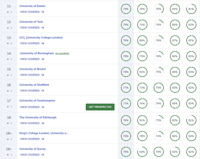 이 구간에서는 요크대학교가 12위로 올라섰어요. 브리스톨대학교도 1계단 올라서 15위에 진입했습니다!