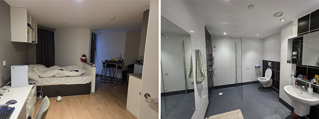 메인 캠퍼스와는 조금 멀지만 기차역에서 도보로 1분 거리에 있었고 스튜디오 타입 (방에 화장실, 부엌까지 다 있는) 으로 월200만원 정도 였는데 비용이 저렴하진 않지만, 같은 수준으로 런던에 살려면 정말 2배 이상은 들거에요. 공간도 넓더라구요.
