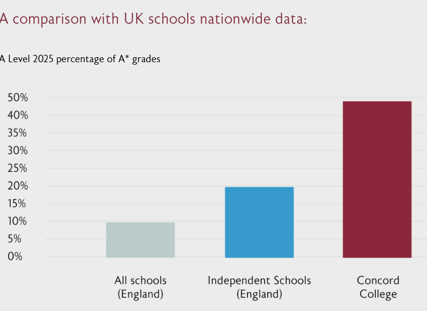 아래 표는 잉글랜드의 모든 학교, 잉글랜드의 사립학교, 그리고 콩코드 컬리지의 A*점수의 퍼센티지를 보여주고 있는데요,