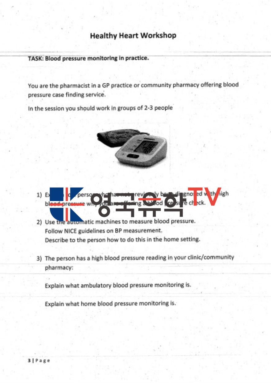 브라이튼대학교에 방문했을 때 약대 학생들이, ‘건강한 심장 워크샵-고혈압의 경우’로 수업중이었어요. 이 자료를 보니, 어떻게 수업이 이루어지는지 좀 더 구체적으로 알 수 있었습니다. 즉, 고혈압이 있는 환자에게 조제를 할 때 어떤 점을 유의해하는지에 대해 배웠습니다.