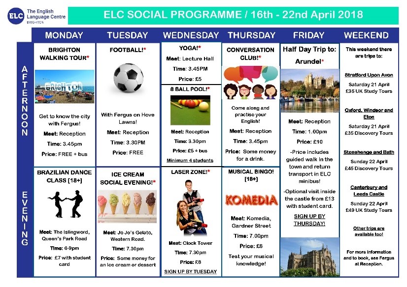 | 16:00–18:00 | 소셜프로그램 매주마다 소셜 프로그램이 바뀝니다. 소셜프로그램을 통해 학교 친구들과 친해지고 학교 밖에서 영어실력을 더 높일 수 있습니다. |