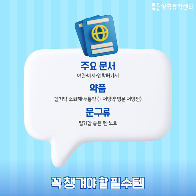 여권, 비자, 입학허가서, 숙소 계약서 같은 건 당연히 챙기셔야죠.