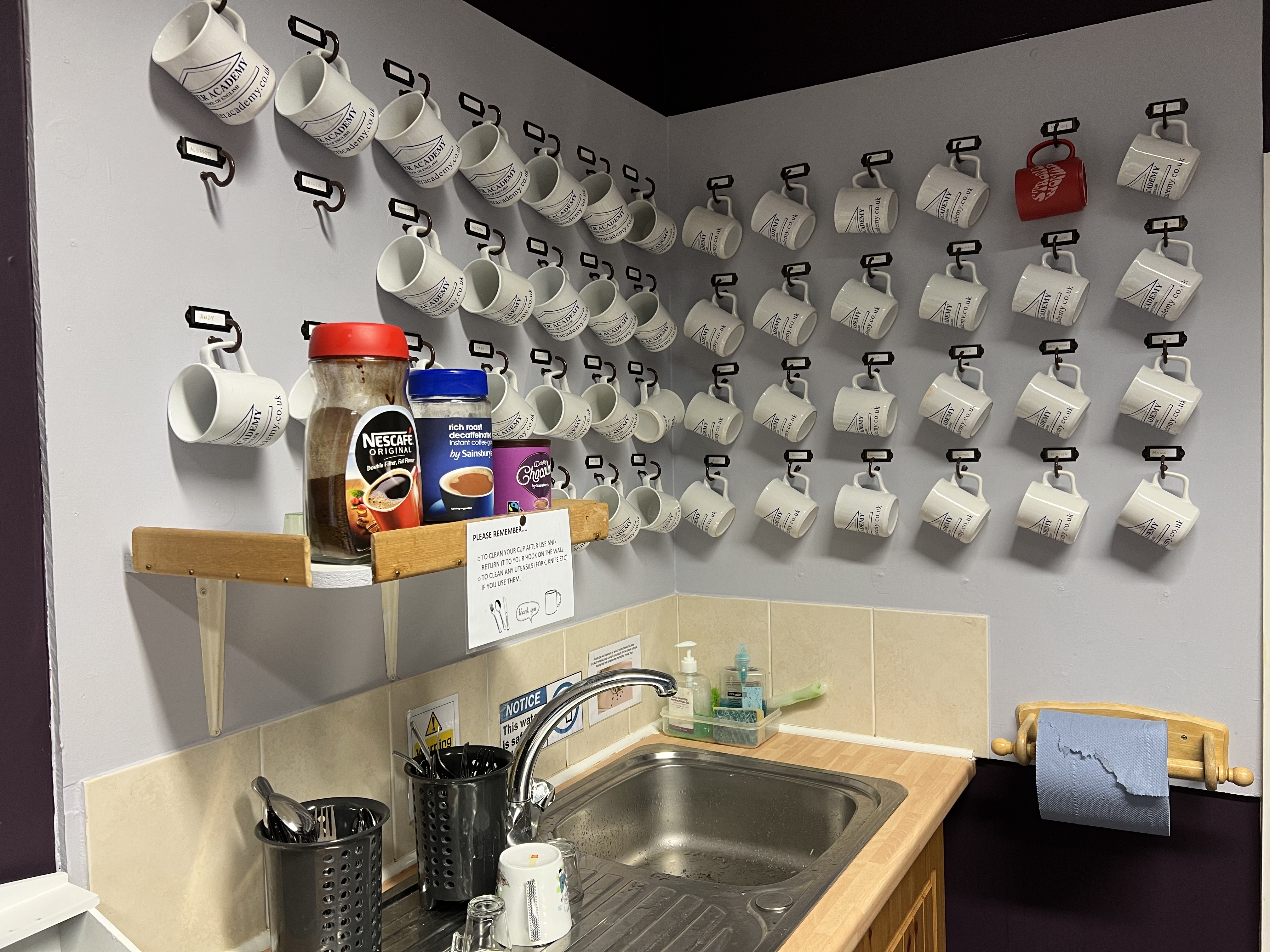벽에 걸려있는 머그컵 보이시나요?! 바로 엑시터 아카데미 어학원 학생분들이 걸어놓은 학생들의 머그컵인데요. Exter Academy 어학원은 학원 첫 날 등교하는 학생분들에게 머그컵을 나눠준다고 해요. 학생분들은 쉬는시간에 라운지에 모여 머그컵에 차나 커피를 마시며 다양한 국적의 학생들과 선생님들과 자유롭게 이야기를 나눌 수 있는 시간을 갖는다고 합니다 ^^