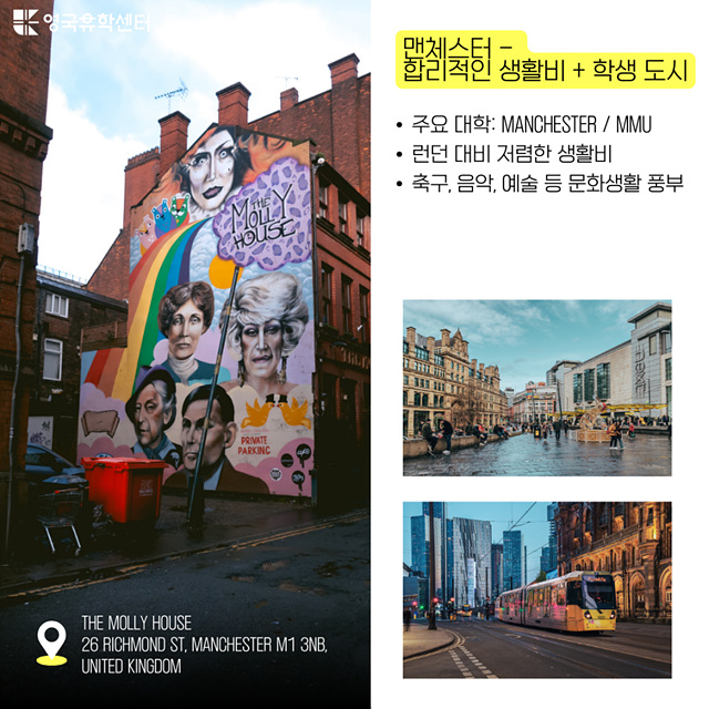 활기차고 학생 친화적인 도시에서 합리적인 비용으로 유학 생활을 하고 싶다면 맨체스터가 딱이에요.