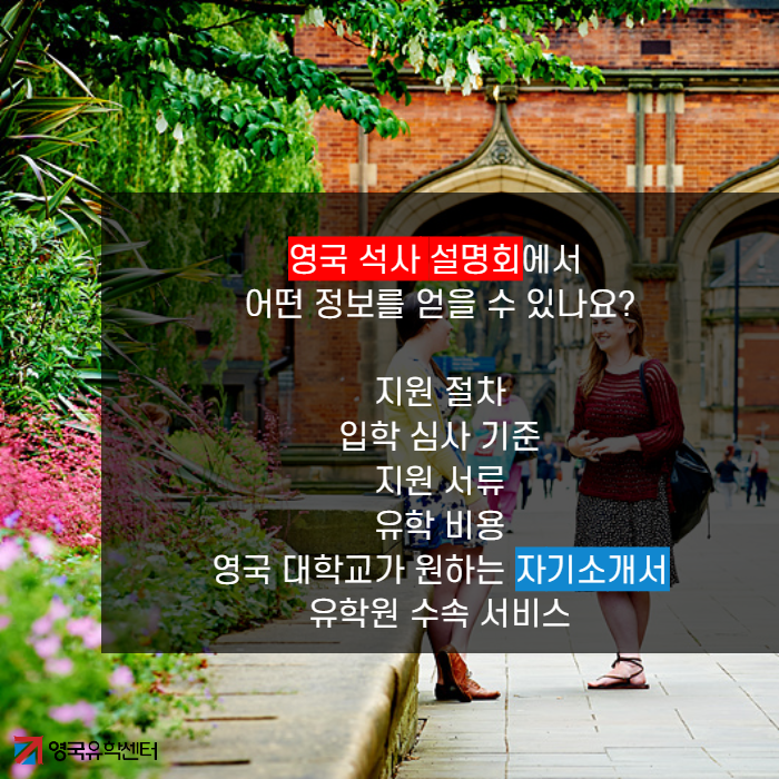2021년 영국 석사과정 입학에 관심있으시다면 이번 설명회에 참석해보세요.  영국유학센터와 함께 학교 선정, 지원서, 자기소개서/추천서 등을 준비해서 입학 가능성을 높일 수 있습니다.
