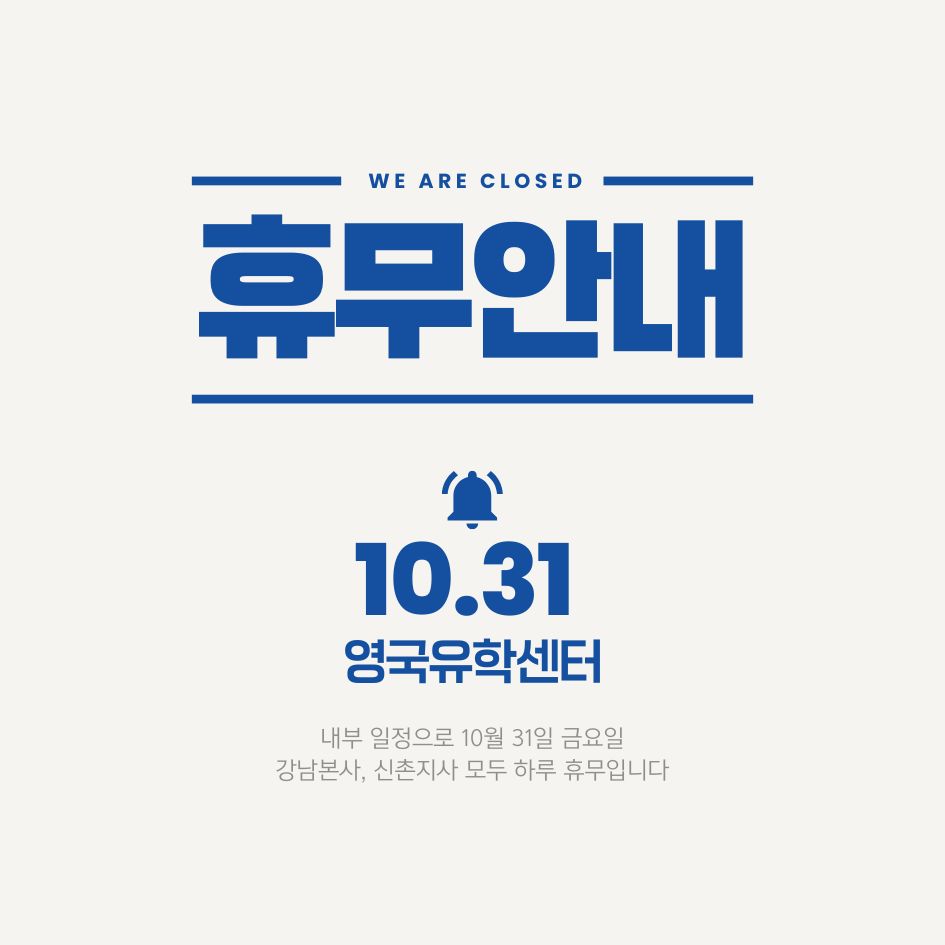 영국유학센터 강남본사, 신촌지사는 10월 31일 금요일 내부 사정으로 휴무입니다.