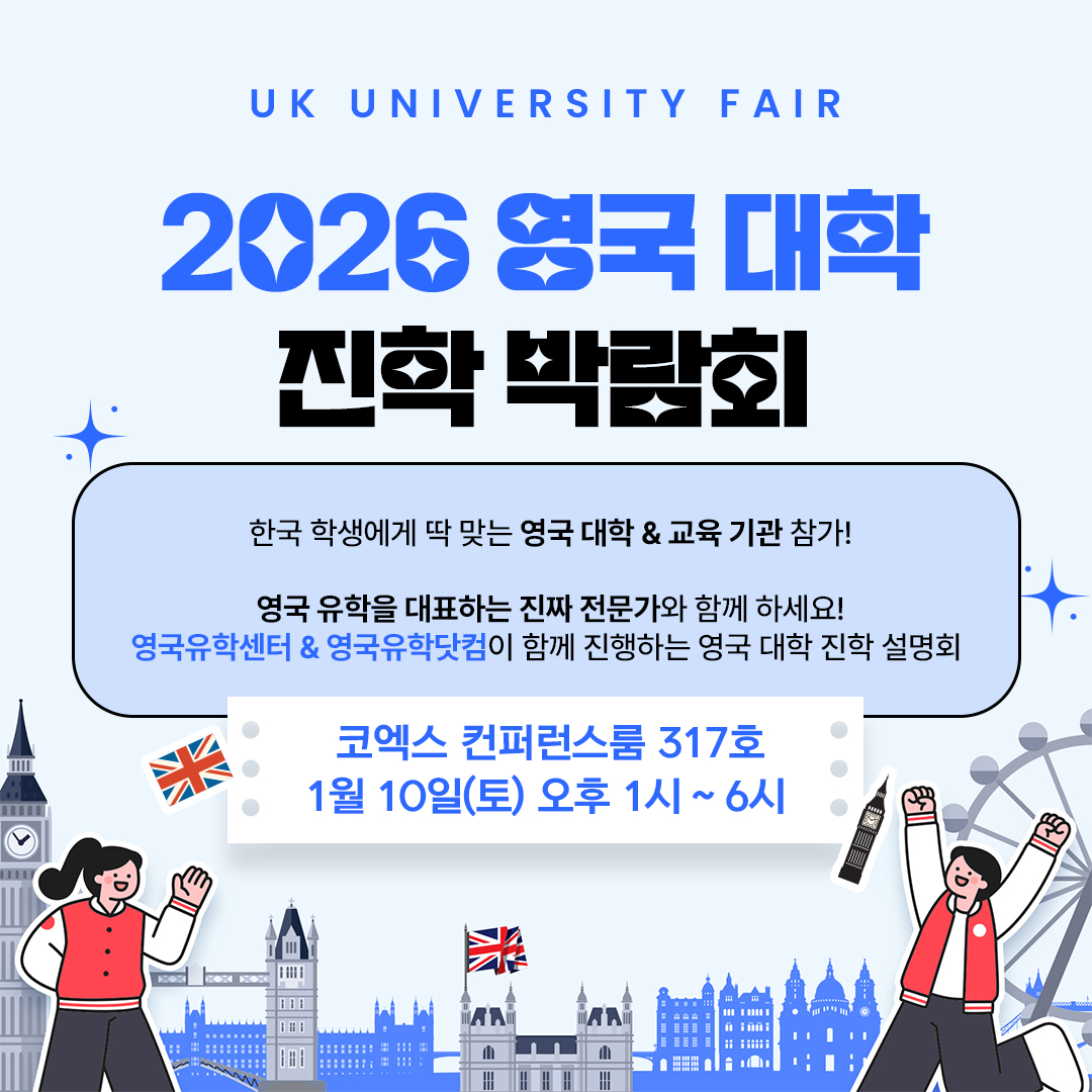영국을 대표하는 전문유학원인 영국유학센터와 영국유학닷컴은 합동으로 오는 2026년 1월 10일(토) 오후 1시부터 6시까지 코엑스 컨퍼런스룸 3층 317호에서 ‘영국대학 진학박람회’를 진행합니다. 60여곳의 영국 대학교 진학 과정을 제공하는 패스웨이 센터와 영국 대학교가 직접 참석해, 영국 유학을 준비하는 학생들에게 최신 정보와 맞춤형 상담을 제공합니다. 참가비는 무료이며, 사전 등록은 필수입니다.