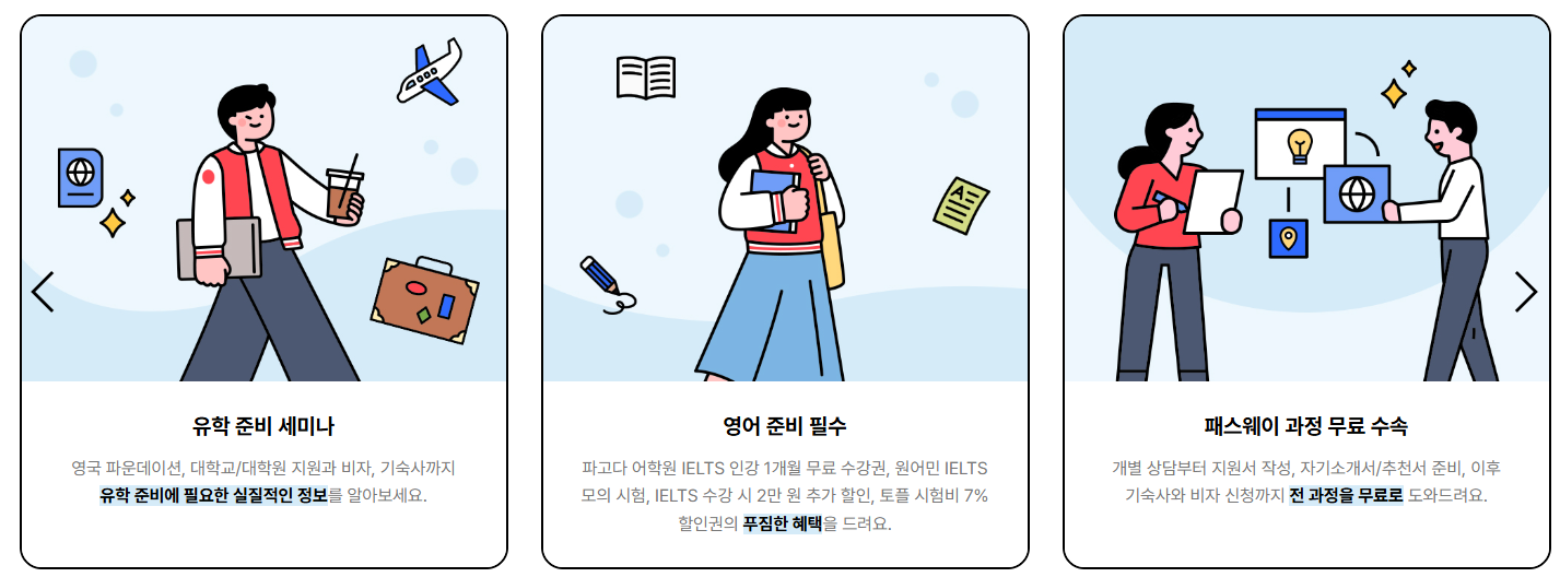 파고다 IELTS 인강 1개월 무료 이용권, 원어민 모의시험, 토플 시험비 할인 등 영어 시험 준비에 필요한 다양한 지원이 제공되며, 영국 대학 및 패스웨이 과정 지원 수속도 무료로 도와드립니다. 대학별·전공별 장학금 정보도 꼼꼼하게 안내 받을 수 있습니다.