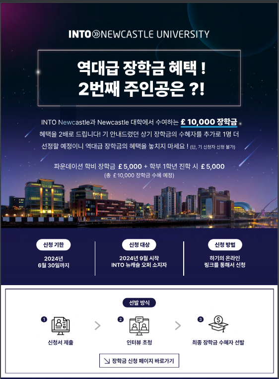 - 장학 금액: 뉴캐슬대학교파운데이션 과정 학비 5,000파운드+본 과정 진학 후 5,000파운드