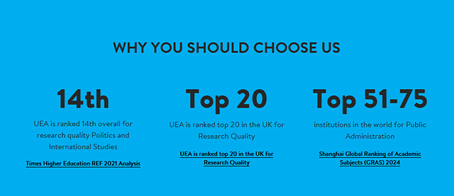 특히 공공정책, 정치학, 국제관계, 환경정책 분야는 UEA의 대표적인 강점으로 꼽힙니다.