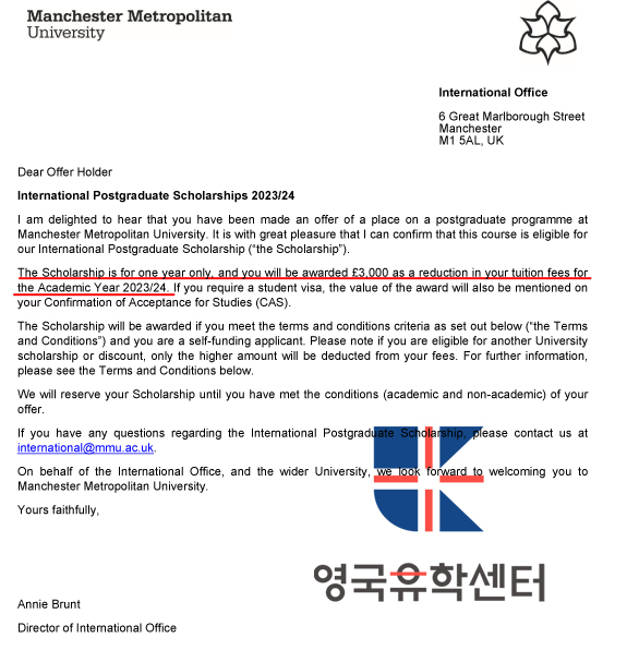 영국유학센터에서 학생분이 MMU 석사장학금 3,000 파운드 수상자로 선정되었습니다.