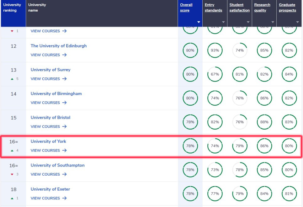 요크대학교는 다른 영국대학교와 비교해 역사가 그리 긴 편이 아님에도 불구하고 전세계 대학순위 167위 (QS World University Ranking 2024) 이자, 영국대학교 랭킹은 16위로 (2024 The Complete University Guide Ranking) 명실상부 명문대학으로 자리매김하고 있는 대학 입니다.