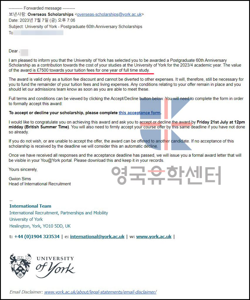 영국 요크대학교 University of York 60주년 장학금 7500파운드 (약 1240만원) 수상자 선정!