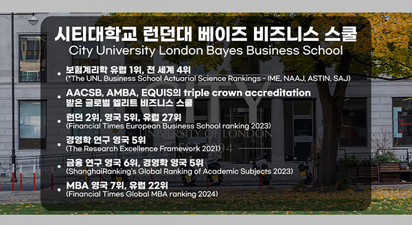 사실 시티대학교에 보험계리학에서의 포지션이 매우 높은 점도 있었고 제가 아는 현직자분들의 조언도 많이 얻었습니다. 그분들이 시티대학교 선배님들이셔서 그분들의 영향도 있었고 런던에 있는 게 낫지 않을까 라는 생각도 이유 중 하나입니다. 현직자 분들은 저희 아버지의 건너 건너 아시는 분들이신데 베이즈 비즈니스 스쿨(Bayes Business School)에서 리스크 관리 쪽 공부를 하셨었고 지금은 영국에서 변호사로 활동하고 계신 분들이라서 되게 저한테 도움을 많이 주신 분들입니다.