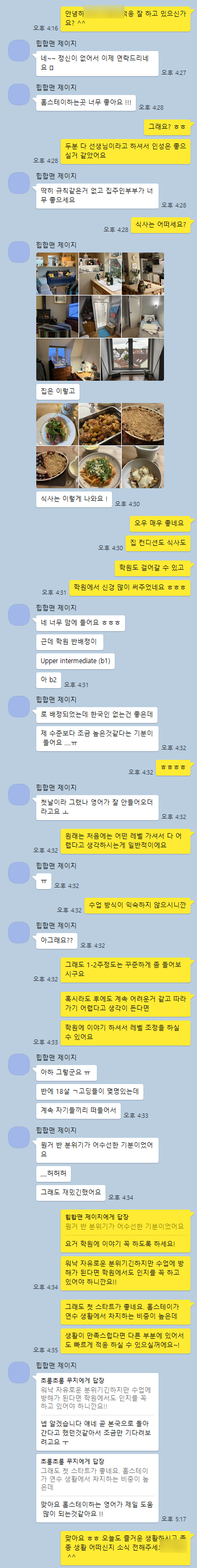 다행히도 홈스테이가 너무 마음에 드신다고 말씀해주셨어요! 홈스테이가 유학 생활에 많은 부분을 차지하는데 케어해주시는 집주인부부도 정말 좋으시고 특별히 다른 규칙은 없다고 해요. 부부 두분 모두 선생님이라고 하셔서 걱정하지 않았는데 역시 너무 좋으신 분들인 것 같네요.^^
