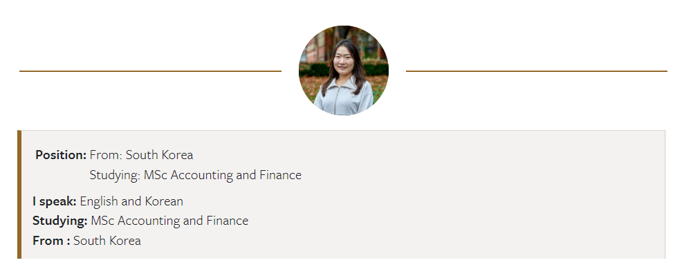 안녕하세요! 저는 리즈대학교 경영대학원에서 회계 및 재무 전공 석사과정에 재학 중인 이** 라고 합니다.
