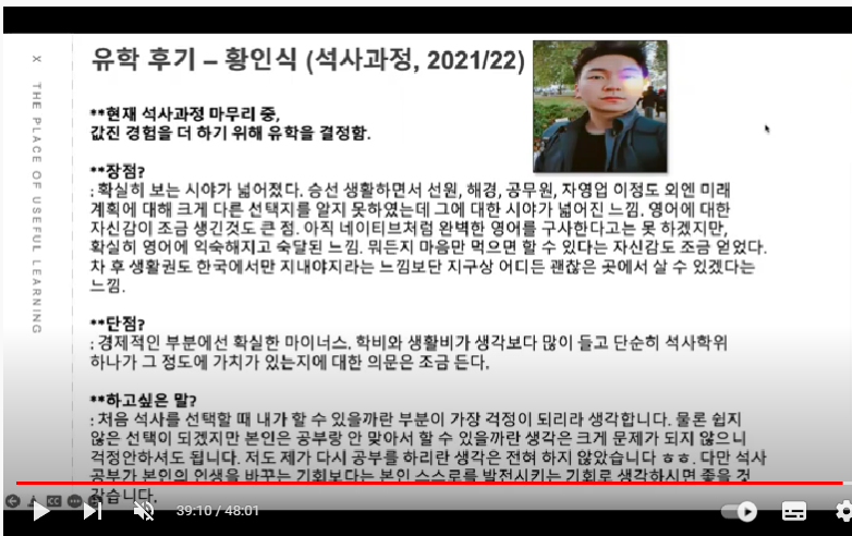 아래 영상에서 스트라스클라이드대학교에서 재직중인 교수님과 박사후 과정을 하시는 분, 재학생 분들이 학교 소개와 함께 글래스고 생활, 또 유학 후기에 대해 얘기합니다.