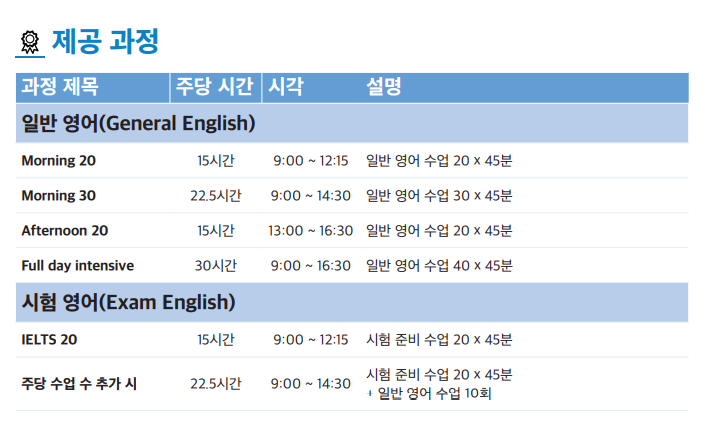 캠브리지 CAE 20, 30레슨 과정, 아이엘츠 20, 30 레슨, 비지니스영어 30레슨 과정이 있다. 개강일은 개별 문의